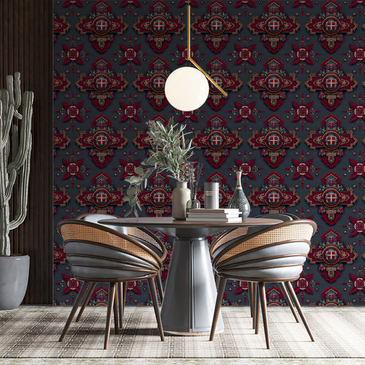 View full detailsThe Traditional Ottoman Brocade Mural Wallpaper is a grand, intricate, and deeply hued repeating print. It features ornate, symmetrical medallions ...