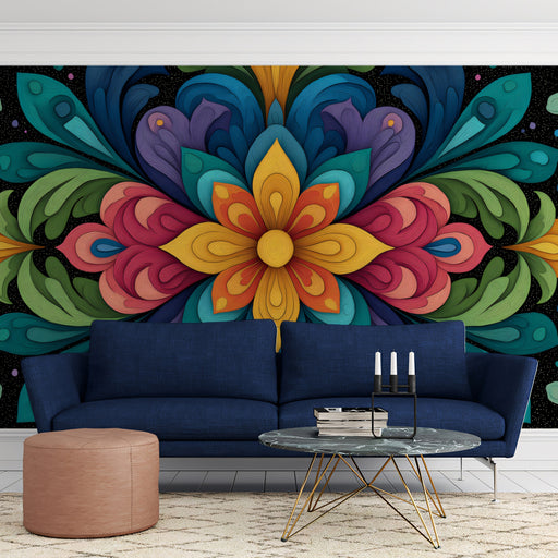 View full detailsThe Colorful Abstract Mandala Mural Wallpaper is a richly colored and dynamic artwork. It features a large, stylized, symmetrical flower/mandala cr...