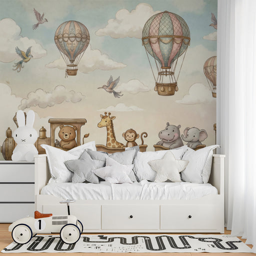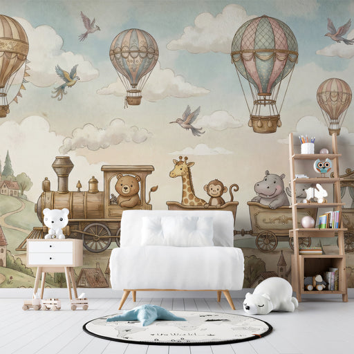 View full details· Embark on a magical journey with this charming storybook animal wallpaper. Featuring a vintage wooden train carrying a bear, giraffe, monkey, hip...