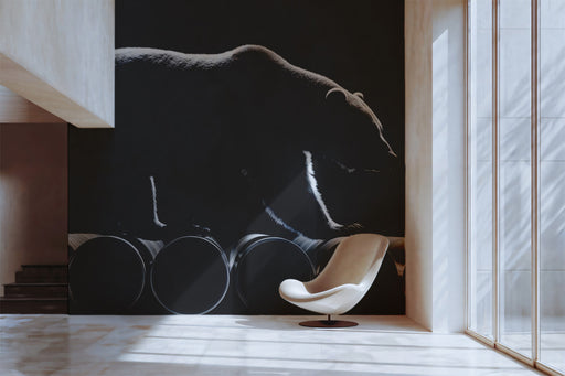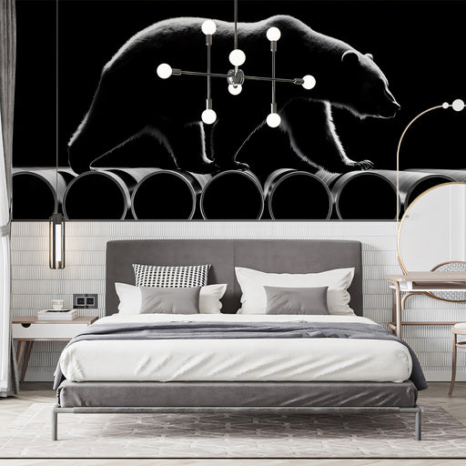 View full detailsThe Monochromatic Bear Silhouette and Pipes Wall Mural features a striking high-contrast silhouette of a majestic bear walking across a row of cyli...