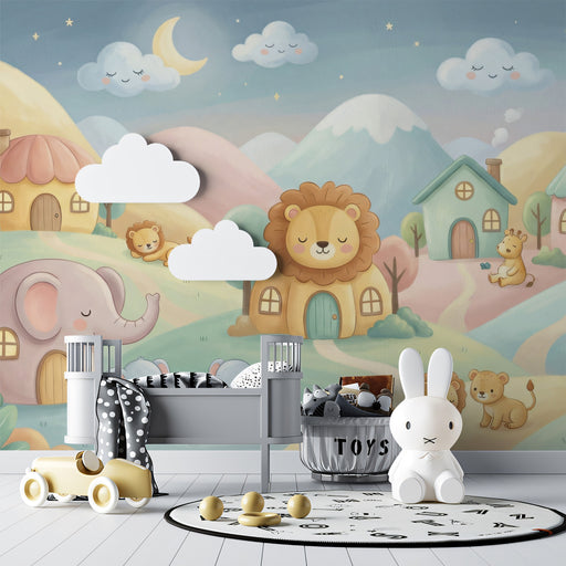 View full detailsThe Pastel Safari Animal Village Landscape Wall Mural features a sweet, dreamy illustration of cute safari animals like elephants, lions, and giraf...