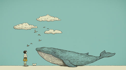 View full details· This wallpaper features a charming hand-drawn illustration of a giant blue whale accompanied by flying birds and a curious child, creating an ima...