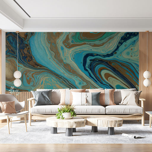 View full detailsAbstract Marble Mural Wallpaper | Turquoise & Gold Silk Swirls