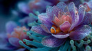 The Clownfish in Purple Lotus Anemone Mural Wallpaper is a stunning, macro-view of a small clownfish resting in a fantastical, lotus-shaped sea anemone. The anemone petals are rendered in luminous purple and magenta with an intricate pattern of white dots, contrasting with the soft orange of the fish and the cool, teal-blue tentacles. This hyper-detailed, surreal image is elegant, complex, and visually immersive. It is ideal for a living room, a sophisticated bedroom, or a space where complex natural beauty and vibrant colors are appreciated.