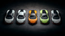 The Overhead Hypercar Lineup Mural Wallpaper is a sleek, oil-painted arrangement. It features five luxury sports cars, viewed directly from above, lined up symmetrically against a dark, textured background. The central orange and lime green cars pop dramatically against the muted white and gray cars on either side. The thick brushstrokes give the scene a unique, textural depth and emphasize the high-performance design of the vehicles. This mural is ideal for a modern study, a contemporary garage, or an accent wall focused on color and precision engineering.