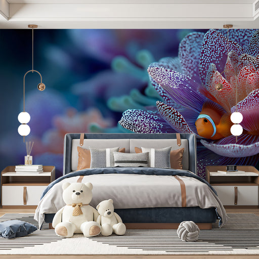 View full detailsClownfish in Purple Lotus Anemone Mural Wallpaper | Surreal Close-Up, Dotted Texture, Blue and Pink Palette