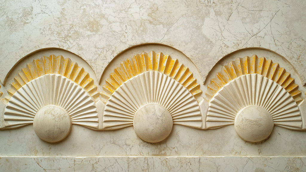 The wallpaper features a single fan - shaped element with a golden - hued center on a beige, marble - like background. In the bathroom, it creates a subtle yet elegant focal point above the bathtub. The 3D - like texture of the fan adds depth, and the neutral color scheme contributes to a calm and luxurious atmosphere, making the bathing area feel like a serene retreat.