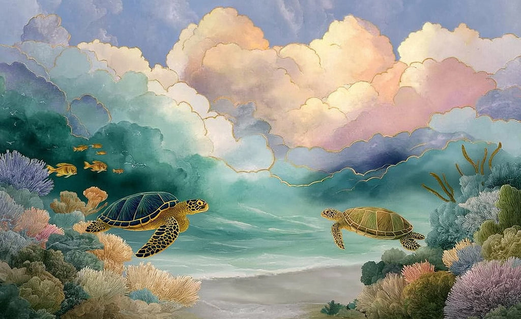 This mesmerizing Ethereal Undersea Mural Wallpaper combines the tranquility of the ocean with the dreaminess of the sky. The design features a stunning, abstract composition where two graceful sea turtles swim through a fantastical scene. The top half showcases swirling, cloud-like forms in soft hues of pink, blue, and gold, while the bottom half depicts a serene underwater world of coral and flowing seaweed. The delicate gold lines weaving through the design add a touch of subtle luxury and magic. This wallpaper is a perfect choice for creating a serene and imaginative atmosphere in a bedroom, a peaceful meditation room, or a unique playroom.