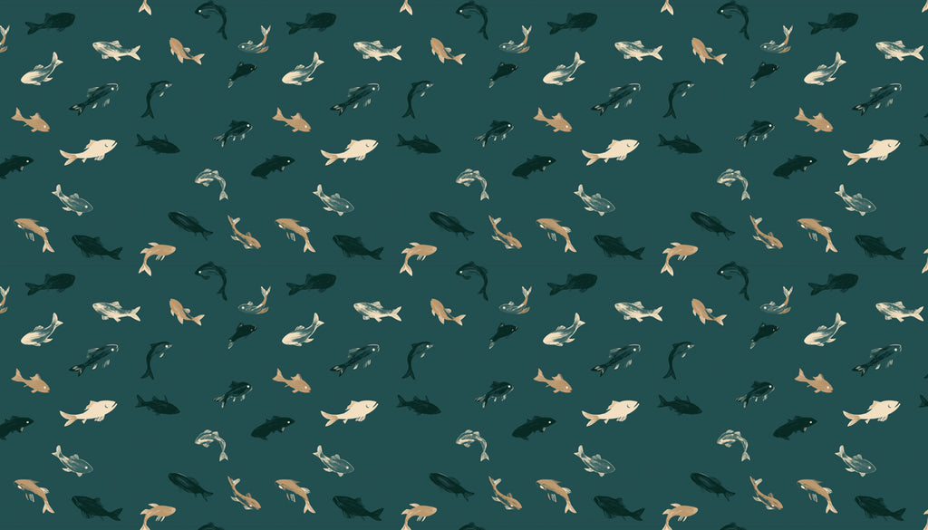 This modern fish pattern wallpaper offers a minimalist and sophisticated take on a nautical theme. The repeating pattern features small, stylized fish swimming in various directions, creating a sense of subtle movement and texture. The refined color palette of deep teal, soft gray, and light beige gives this sea life wallpaper a tranquil and contemporary feel. It's an excellent choice for a chic bedroom, a quiet study, or a stylish restaurant where it can add a touch of simple elegance and visual interest without overwhelming the space.