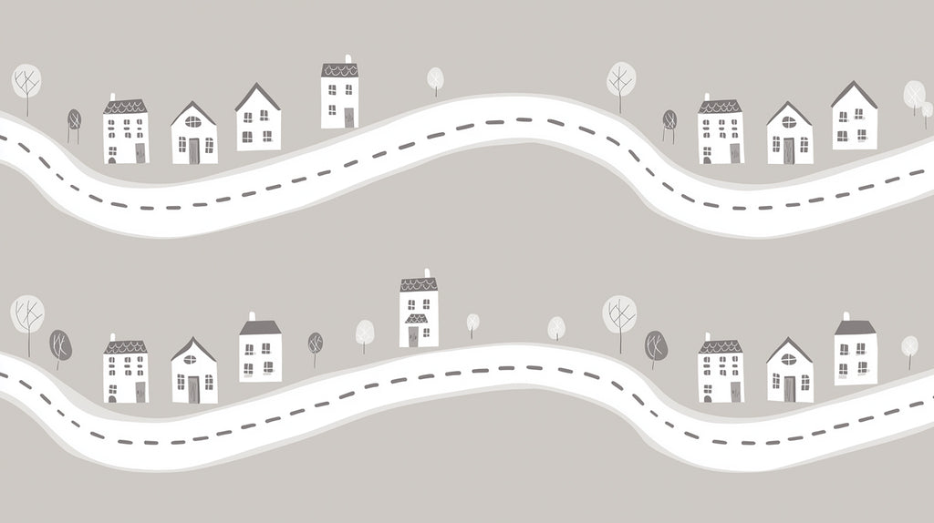 The Monochromatic Roadside Village Pattern is a clean and versatile scenic design. It features two horizontal, wavy dashed roads running through a neutral taupe-gray field, lined with stylized white and gray houses and sparse trees. The simple, graphic style and neutral palette make it an excellent backdrop for interactive play with toy cars. This mural is ideal for a minimalist children's room or a subtly themed bedroom.