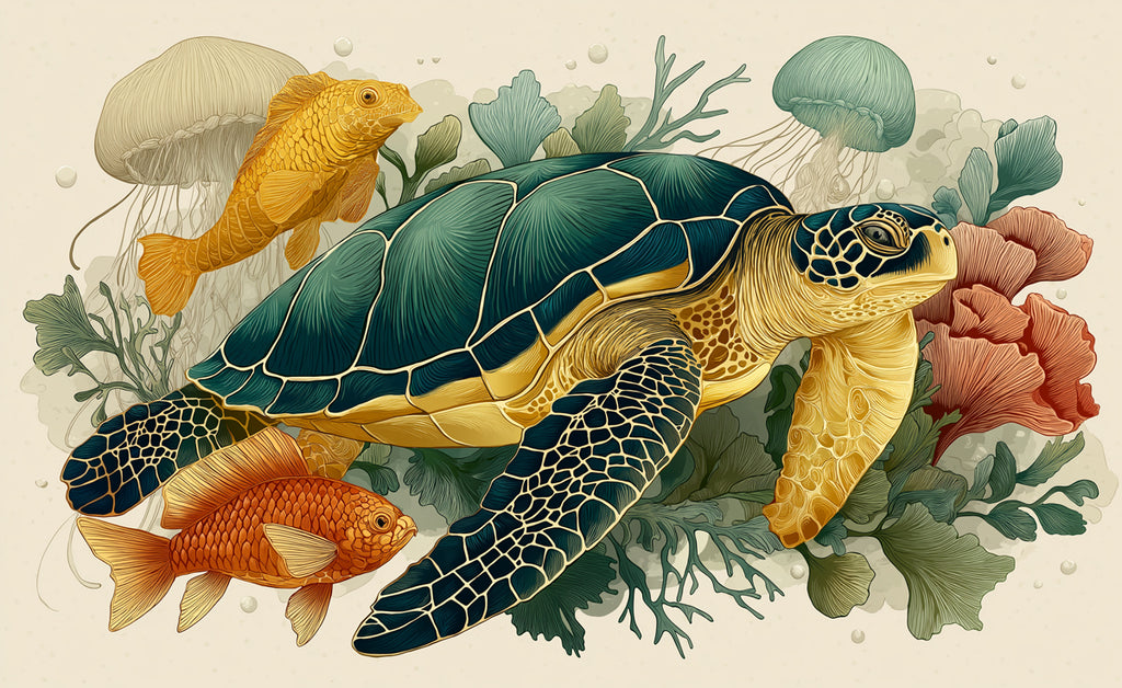This enchanting Underwater Fantasy Mural Wallpaper brings a sense of serene magic to any space. The design features a magnificent sea turtle and two playful fish swimming gracefully amidst a beautiful collection of colorful coral, stylized seaweeds, and delicate jellyfish. The soft, artistic rendering and a muted palette of teal green, warm golden yellow, and gentle coral pink create a peaceful and whimsical atmosphere. This wallpaper is a perfect choice for a nursery, a calming living room, or a creative study.