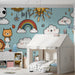 The Doodle Animal Cloud Wallpaper is a cheerful and playful design. The pattern features an all-over, hand-drawn style collection of happy animals (cats, lions, giraffe, panda), smiling clouds, suns, and rainbows on a bright sky-blue background. The vibrant, childlike doodles and lighthearted composition make it a fantastic choice for stimulating creativity and happiness. This mural is ideal for a nursery, a child's bedroom, or an elementary classroom.