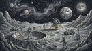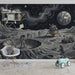 A detailed, monochromatic mural celebrating space exploration. Rendered in a vintage engraving or sketch style, it depicts astronauts on the lunar surface with a lander, a rover, and the Earth rising in the distance. Swirling galaxies in the dark sky add a touch of artistic flair to the scientific scene.
