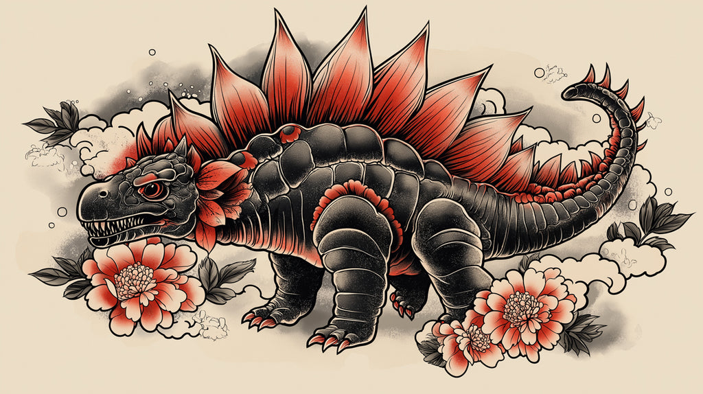 Unleash your wild side with this captivating wallpaper, featuring a powerful stegosaurus rendered in a dramatic, tattoo-inspired art style. The dinosaur is depicted with dark, armored scales and striking red-orange plates along its back and tail, creating an imposing yet artistic presence. Surrounding it are beautifully stylized flowers (peonies) and subtle ink splatters, adding a touch of elegant flair to the fierce creature. The clean, light background allows the bold design to truly pop. This illustration is perfect for creating a unique, edgy, and artistic atmosphere in studies, gaming rooms, or any space that celebrates bold design, ancient creatures, and a touch of rebellious art.
