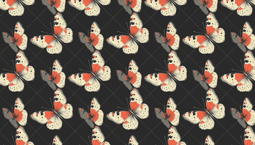 This wallpaper features a bold, high-contrast pattern of Monarch-like butterflies with intricate wing details. The design is rendered in a striking palette of bright orange-red, black, and white, set against a dark background with a subtle geometric grid. The detailed and vibrant motif creates a dynamic visual statement. It's an ideal choice for a dramatic cafe, a chic entryway, or a modern living room. It pairs perfectly with contemporary, glam, or eclectic interiors.