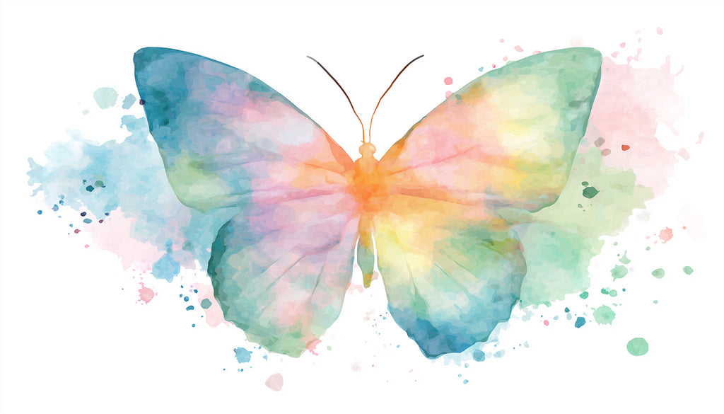 The Luminous Watercolor Butterfly Mural Wallpaper features a single, vibrant butterfly rendered in a loose, expressive watercolor style. The wings are a beautiful fusion of rainbow colors, including pink, blue, purple, and yellow, with drips and splashes of paint adding to its artistic charm. This design is a joyful and modern piece of art that brings a sense of light, color, and playful elegance to any space.