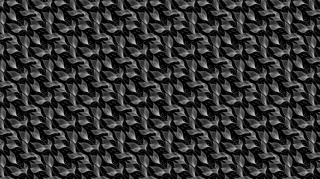 The Micro Sheer Leaf Texture Wallpaper is a subtle, high-density pattern with a graphic edge. It features a tight, repeating diagonal arrangement of sheer, stylized leaves in shades of gray and white on a black background. The pattern is dense and small-scale, creating a strong, uniform texture that reads as a subtle metallic or woven pattern from a distance. This mural is ideal for adding sophisticated texture to a small space or complementing bold furniture in a bedroom.
