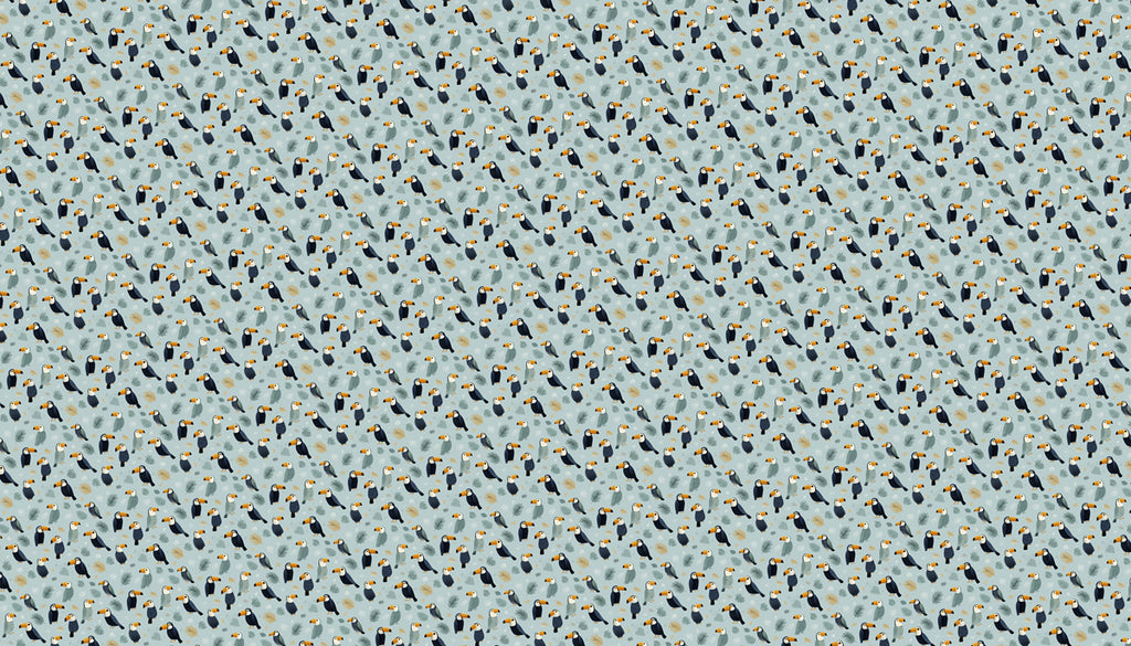 This mini toucan wallpaper adds a subtle and delightful touch of tropical charm to any space. The design features a delicate, repeating pattern of small, stylized toucans and tropical leaves. The soft, calming color palette of blues and grays, accented by the toucan’s signature orange beak, creates a whimsical yet refined feel. This small-scale wallpaper is perfect for creating a cozy atmosphere in a cafe, a powder room, or a study, where its gentle pattern adds texture without overwhelming the room.
