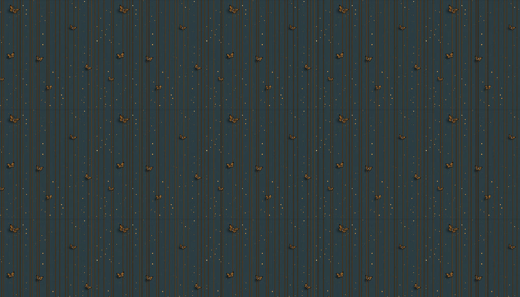 This wallpaper features a subtle and elegant minimalist design. The pattern showcases fine vertical lines and a scatter of tiny gold specks, with small, simple butterflies in a soft gold tone. The design, set against a calm, dusty blue background, creates a serene and quiet atmosphere. It's an ideal choice for a peaceful bedroom, a calm home office, or a meditative living room. It pairs beautifully with Scandinavian, minimalist, or transitional interiors.