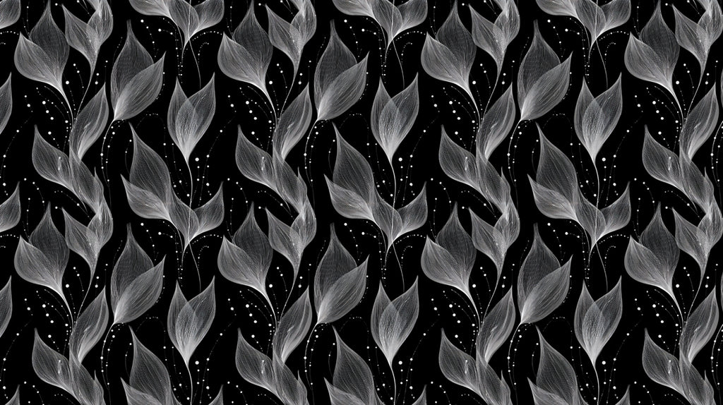 The Monochrome Botanical Flow Mural is an elegant and ethereal design. The pattern showcases tall, flowing stalks with sheer, translucent leaf shapes in white and light gray against a solid black background. The subtle dotted accents scattered around the stalks add a light, sparkling effect. The vertical movement and delicate lines create a sense of graceful, weightless growth. This mural is perfect for a chic entryway, a sophisticated dining room, or a dramatic powder room.