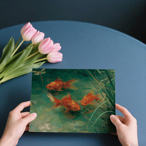 The deep blue tones of the background provide a calming and immersive base, reminiscent of the ocean's depths. The golden stars and the metallic sheen of the fish add a touch of luxury and contrast, creating a visually striking balance. The different shades of blue work together to create a sense of movement and depth, while the celestial elements enhance the mystical atmosphere.