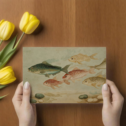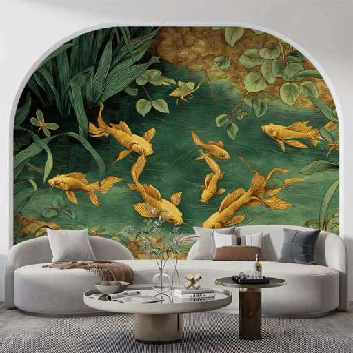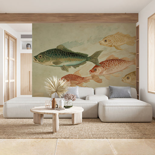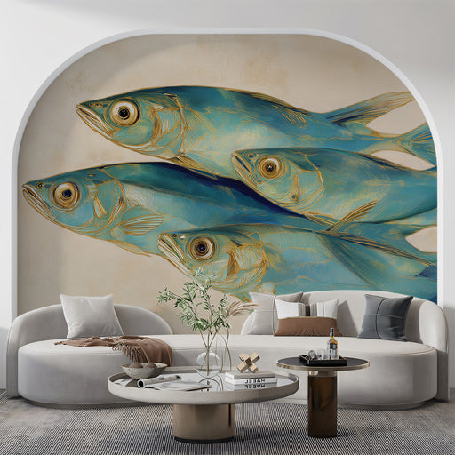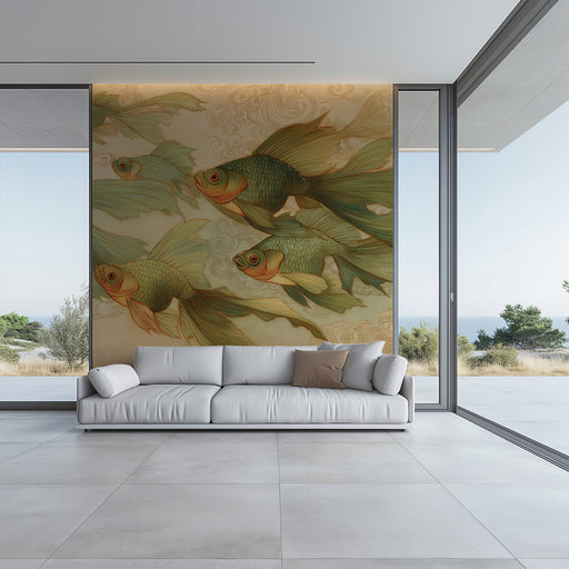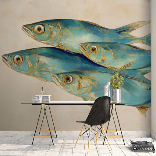 This wallpaper features two large, intricately - detailed fish swimming amidst a sea of deep blue and celestial elements. The fish have a shimmering, almost metallic appearance, with their scales and fins delicately rendered. The background is a blend of dark and light blues, creating a sense of depth, and is dotted with golden stars and nebulous swirls, giving it a cosmic underwater feel. The overall effect is one of mystery and enchantment, perfectly capturing the dreamy and intuitive nature of the Pisces zodiac sign. It can transform a living room into a serene and otherworldly space.