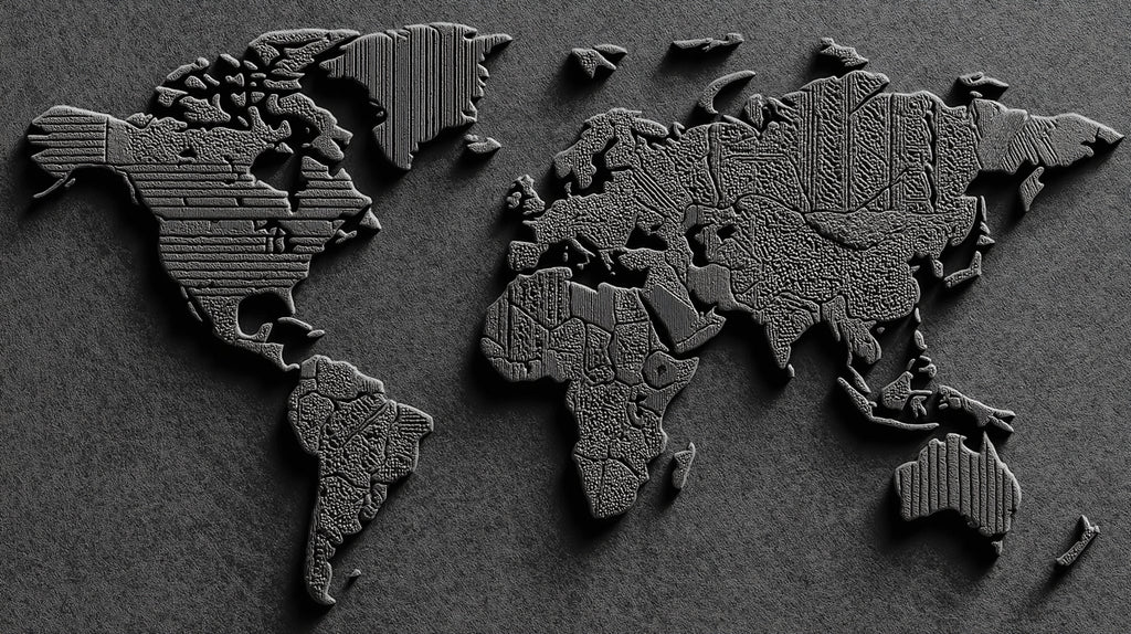 The Textured Relief World Map Mural Wallpaper is a highly tactile and industrial-styled artwork. The continents are raised from a dark gray background, each landmass composed of distinct, geometric textures—linear grooves, tiny dots, and horizontal bars—giving the map a complex, embossed metal or mechanical panel effect. The monochrome gray palette and deep shadows create a strong, dramatic, and masculine aesthetic. This mural is ideal for an industrial-style loft, an architectural firm's office, or a modern living space seeking a textural, minimalist focus.
