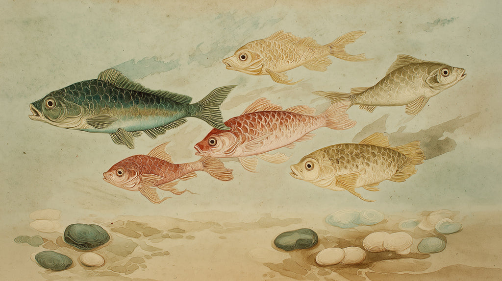 Adorn your space with the timeless elegance of classic art with this captivating wallpaper, featuring a beautiful painting of a school of fish gracefully swimming in clear, green-tinged water. The fish, in various shades of gold, red, and blue, are depicted with intricate details, creating a sense of history, tranquility, and the profound beauty of aquatic life. The subtle, painterly style and soft, light background evoke a sense of peace and calm. This illustration is perfect for creating a calm, inviting, and peaceful atmosphere in living room, bathroom, or any space that appreciates classic fine art and serene natural scenes.