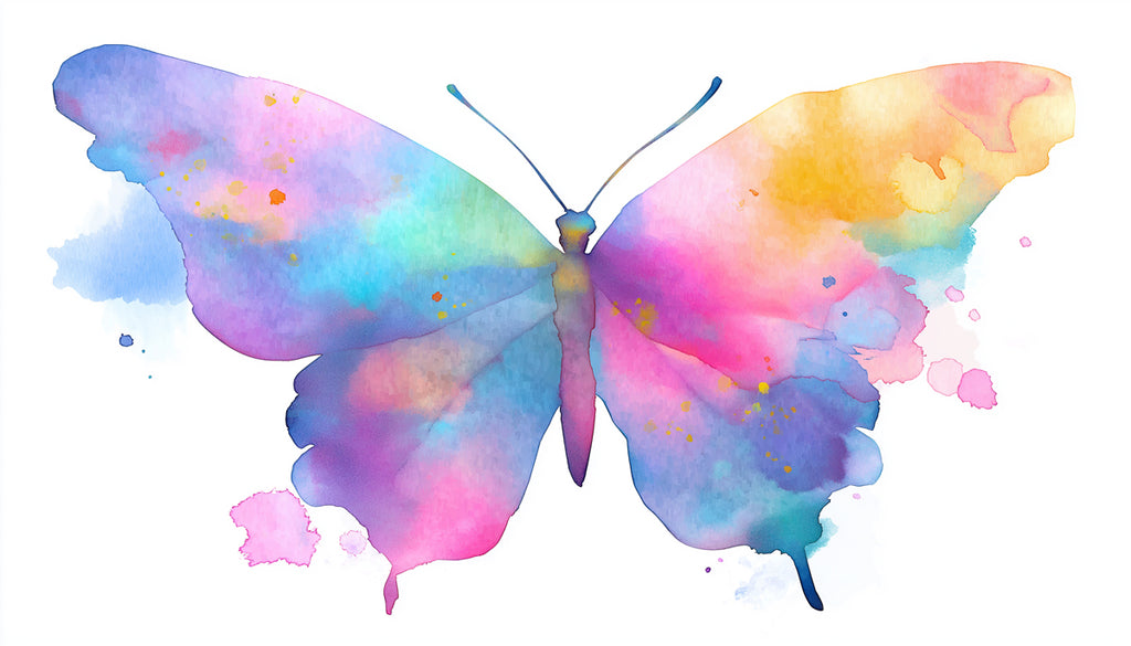 The Watercolor Butterfly Mural Wallpaper features a single, vibrant butterfly rendered in a loose, expressive watercolor style. The wings are a beautiful fusion of rainbow colors, including pink, blue, purple, and yellow, with drips and splashes of paint adding to its artistic charm. This design is a joyful and modern piece of art that brings a sense of light, color, and playful elegance to any space.