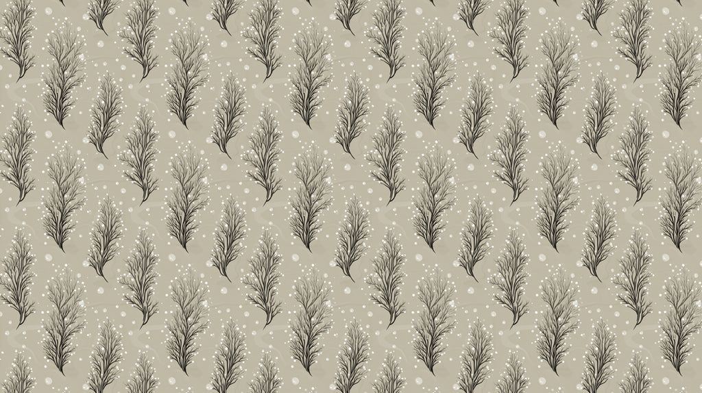 The Winter Branch Mural Wallpaper is a serene and atmospheric design. It features a repeating vertical motif of bare, stylized branches or winter sprigs with a frosted, subtle snow effect (tiny white dots) on a gentle dusty taupe-gray background. The delicate, painterly texture of the branches creates an organic, yet orderly rhythm. This mural is perfect for a calming master dining room, a modern home office, or any space seeking a soft, nature-inspired texture.
