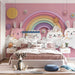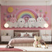 The Paper-Cut Animal Rainbow Arch Mural is a sweet and organized design. It features four charming animals (two bunnies, two kittens) resting on fluffy white paper-cut clouds beneath a layered pastel rainbow arch. The scene is accented with beautiful, multi-colored paper flowers against a clean bubblegum pink background. The layered paper-cut style adds a sophisticated texture to the cute motif. This mural is ideal for a girl's bedroom or a creative space.