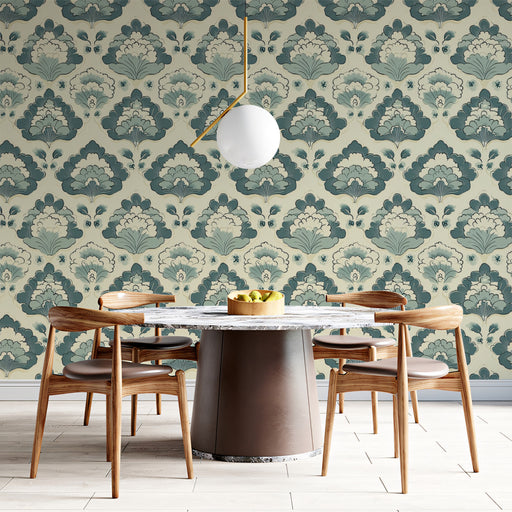 VIVAWALLSThe Classic Floral Mural Wallpaper is a serene and sophisticated piece of art. The design features a repeating damask floral medallion pattern, ren...