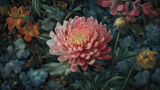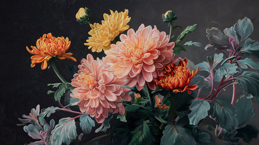 View full detailsVibrant Chrysanthemum Painting Mural Wallpaper | Classic Floral Art with Dark Background