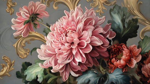 View full detailsRococo Floral Chrysanthemum Mural Wallpaper | Classic Art with Golden Scrolls