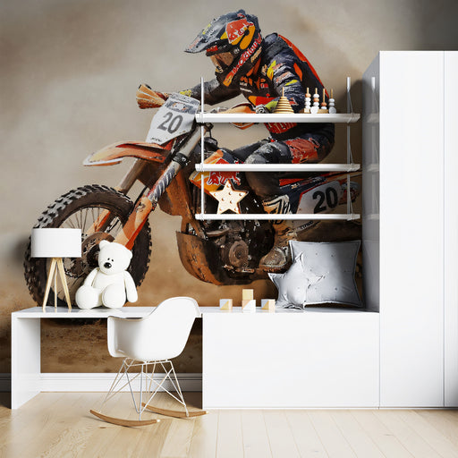 View full detailsIntense Desert Motocross Mural Wallpaper | Dust Cloud, High-Action Realism, Fiery Orange Palette