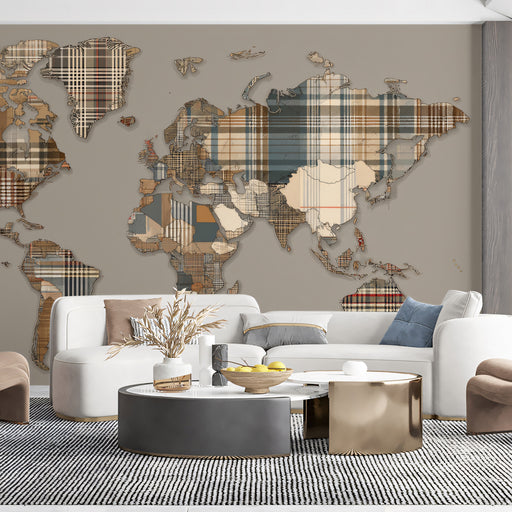 View full detailsPlaid Patchwork World Map Mural Wallpaper | Repeating Print, Earth Tones, Textile Geometric Cartography