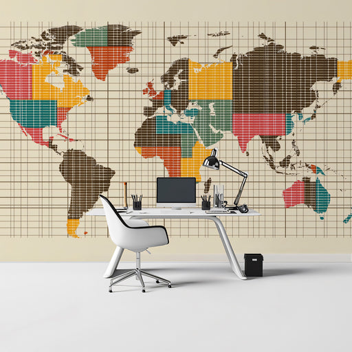 View full detailsMid-Century Grid World Map Mural Wallpaper | Retro Color Blocks, Cartesian Grid, Minimalist Cartography