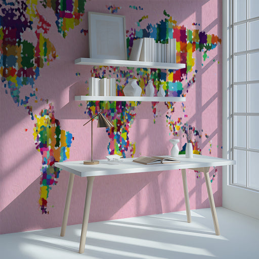 View full detailsImpressionist Pointillism World Map Mural Wallpaper | Oil Paint Texture, High Saturation, Pink Backdrop