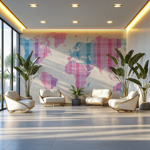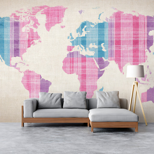 View full detailsPastel Plaid World Map Mural Wallpaper | Textile Texture, Pink, Blue, and Purple Tones, Soft Geometric