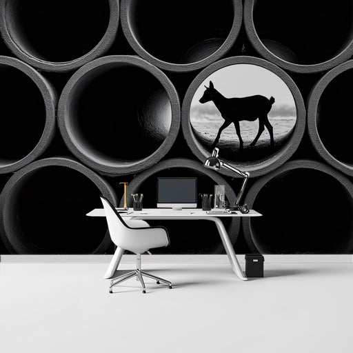Digital Constellation Deer Wall Mural | Futuristic Glowing Wireframe Wildlife & Serene Lakeside Landscape