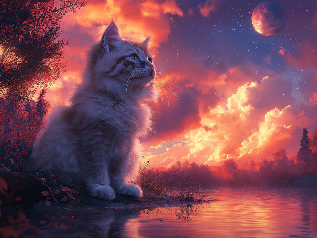 This wallpaper showcases a fluffy gray cat with striking blue eyes, gazing into the distance against a backdrop of a stunning sunset sky. The sky is filled with warm oranges, reds, and purples, along with fluffy clouds and a visible moon. The mural creates a serene and dreamy atmosphere, making it an ideal addition to a bedroom. It can evoke a sense of calm and wonder, as if the cat is lost in thought while enjoying the beauty of the sunset.