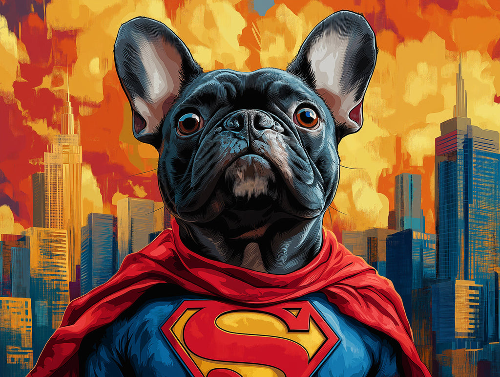 The dark fur of the French bulldog contrasts with the bright red of the cape and the yellow - blue of the Superman emblem. The colorful cityscape in the background complements these colors, with its mix of warm and cool tones. The overall color scheme is bold and cheerful, appealing to a child's sense of wonder and creativity.