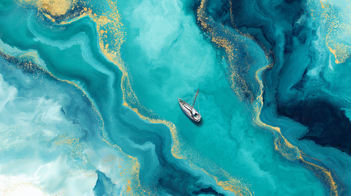 View full detailsVibrant Teal Gold Ocean Fluid Art Mural Wallpaper | Aerial Boat Scene