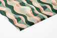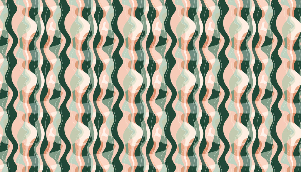 This wallpaper features a bold, layered pattern of large, wavy stripes. The design, in a rich color palette of deep forest green, soft peach, and hints of pale green, creates a fluid, rhythmic movement. The slightly transparent quality of the layers adds visual depth and an artistic, modern feel to the design. It's an excellent choice for a stylish living room, a serene study, or a meditative space. It pairs beautifully with contemporary, bohemian, or modern rustic interiors.