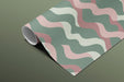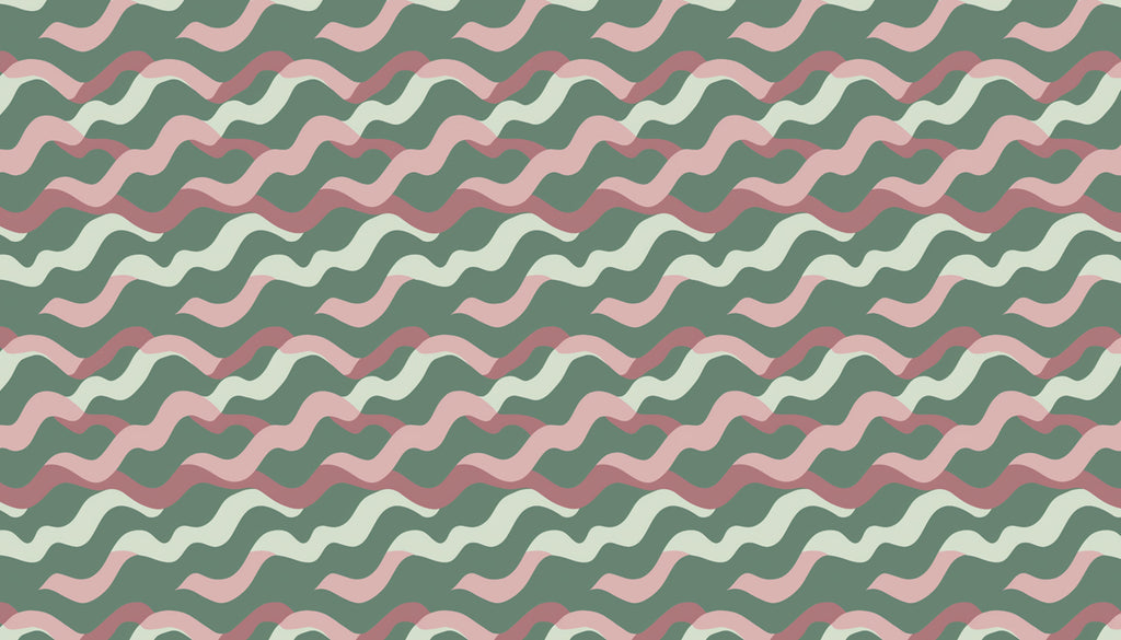 This wallpaper features a dense, retro-inspired pattern of diagonal wavy stripes. The design, in a sophisticated earthy palette of sage green, off-white, and a deep dusty rose, creates a dynamic and rhythmic feel. The bold, repeating lines add a sense of playful energy and vintage charm. It's an excellent choice for a stylish home office, a retro-inspired living room, or a unique dining area. It pairs beautifully with mid-century modern, contemporary, or bohemian interiors.