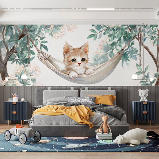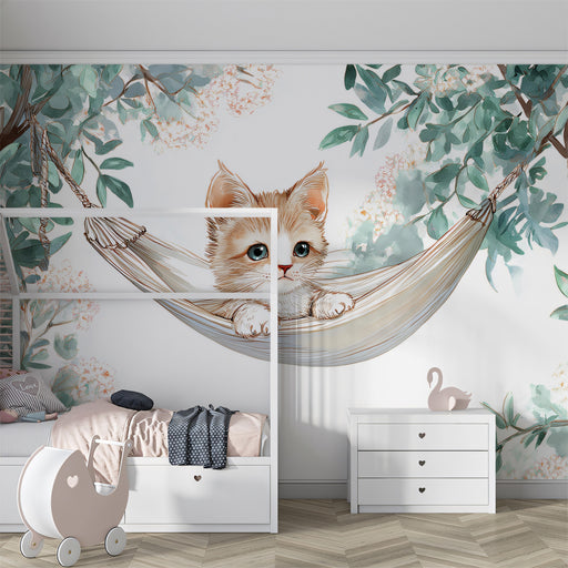 The Paper-Cut Animal Rainbow Arch Mural is a sweet and organized design. It features four charming animals (two bunnies, two kittens) resting on fluffy white paper-cut clouds beneath a layered pastel rainbow arch. The scene is accented with beautiful, multi-colored paper flowers against a clean bubblegum pink background. The layered paper-cut style adds a sophisticated texture to the cute motif. This mural is ideal for a girl's bedroom or a creative space.