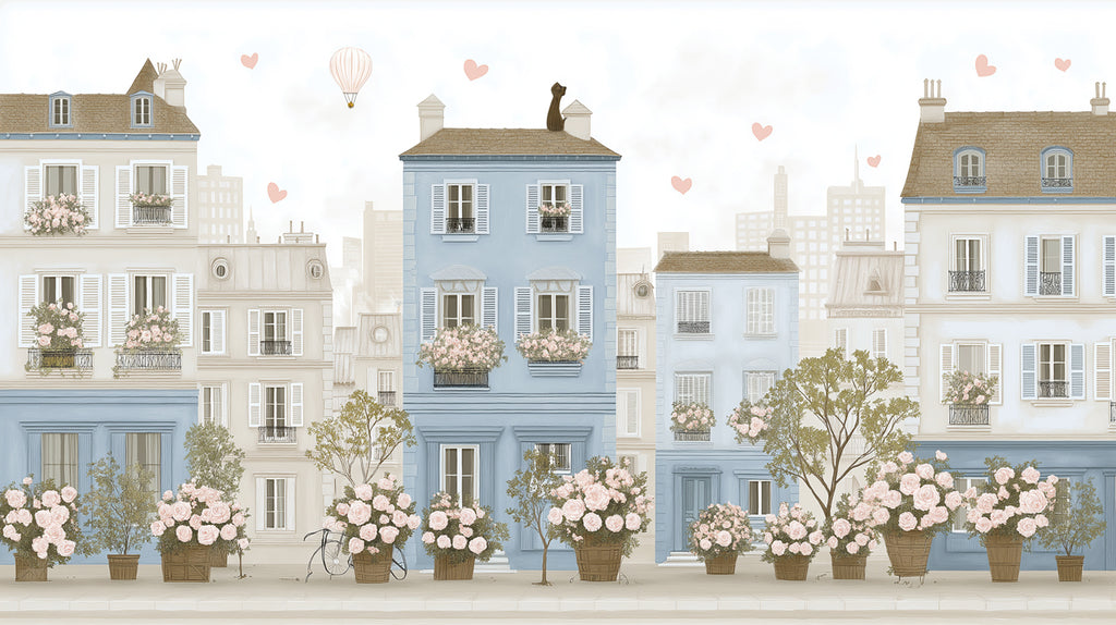 The Parisian Cafe Street Floral Scene Mural Wallpaper is an elegant and calming piece of art. The design features a beautifully balanced streetscape of classic Parisian buildings in muted creams and a distinctive soft blue, with subtle city silhouettes in the background. Large baskets of blush pink roses and small, delicate trees line the street level, creating a sense of serene abundance. A hot air balloon and floating hearts in the pale sky add a sweet, romantic detail. The clean, illustrative style and soft colors evoke the peaceful, refined atmosphere of a spring morning stroll. This mural is an ideal choice for a sophisticated nursery, a tranquil bedroom, or an elegant master suite.