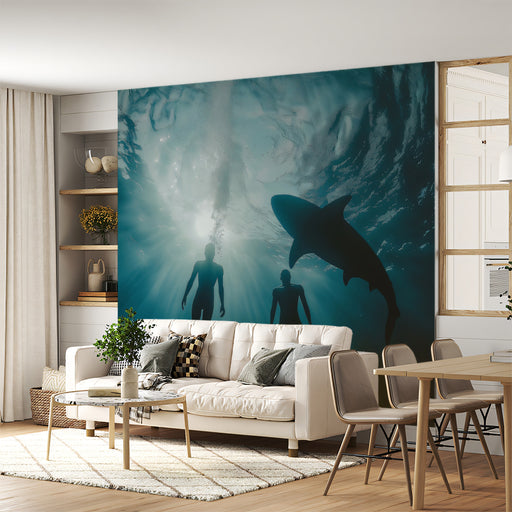 VIVAWALLSThe Deep Dive with Shark Silhouette Mural is a moody, minimalist, and suspenseful underwater scene. Two human figures in dark silhouettes swim upwa...