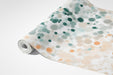 This modern abstract wallpaper offers a subtle and artistic texture to any room. The repeating pattern features a soft, all-over print of organic speckles or dots in a beautiful mix of warm peach and cool teal. The contrasting color palette and minimalist style create a clean yet playful feel that is perfect for a variety of contemporary interiors. This abstract wallpaper is an excellent choice for a home office, a modern bathroom, or a stylish entryway where it can add a layer of texture and visual interest.
