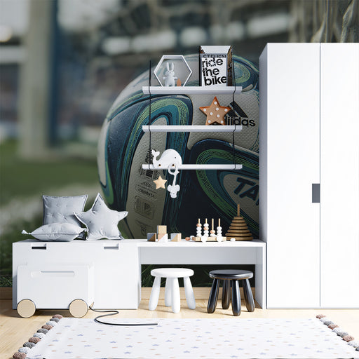 View full detailsAdidas Tango Soccer Ball Close-up Mural Wallpaper | Cinematic Realism, Blue and Green Swirl, Goal Net Focus